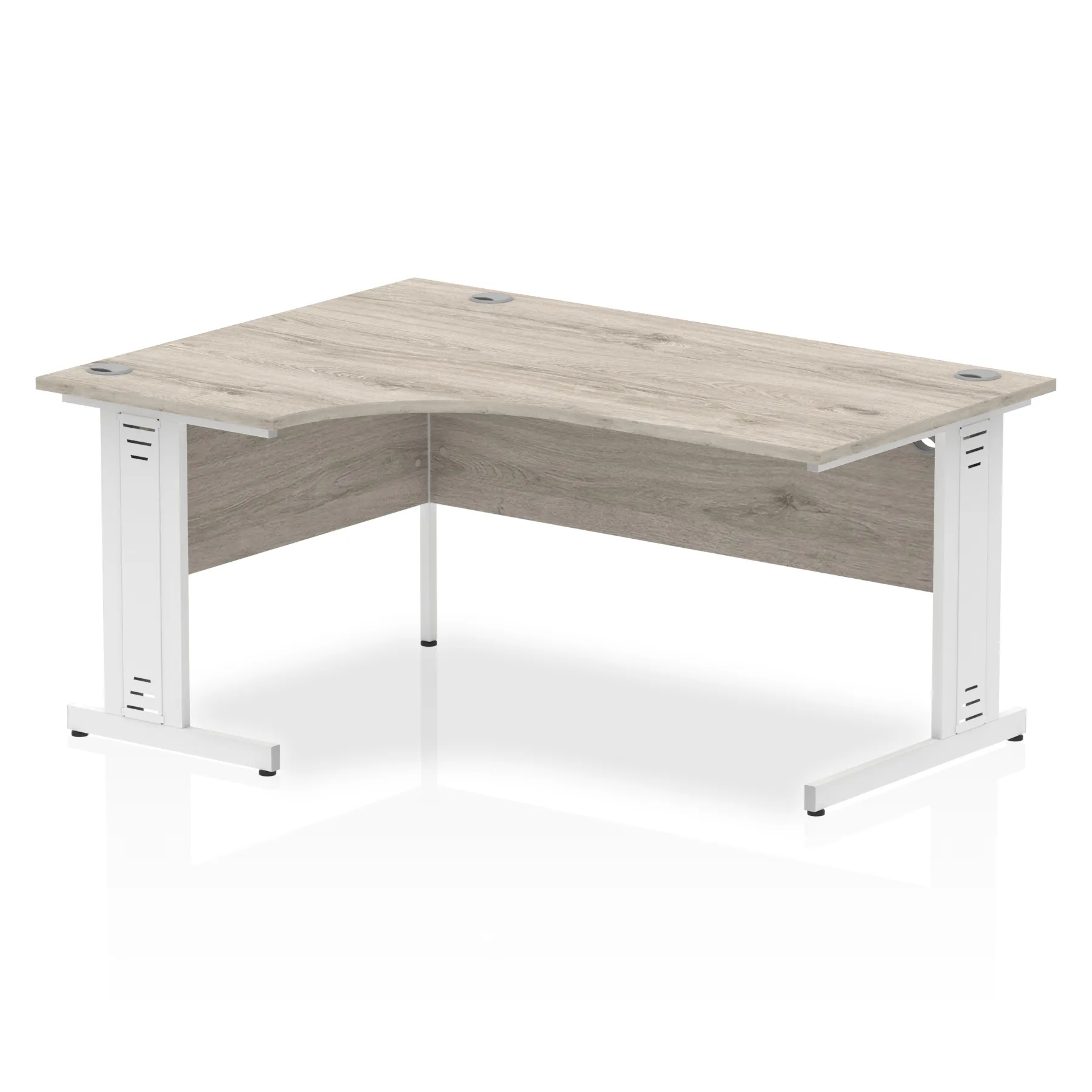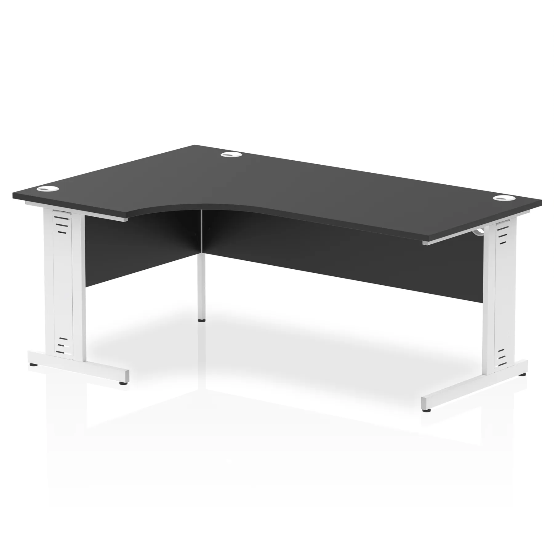 • Impulse contract 1800 wide crescent desk • 25mm tops • Heat resistant melamine finish • 18mm modesty panels • 2mm protective abs edging • Double strut legs • 3 cable ports • Height adjustable feet • Steel to steel fixings • 3 modesty panels slots • 600 deep • Deep set modesty panel (5″) allows for compatibility of most screen clamp fittings • Weight Capacity: 135Kg