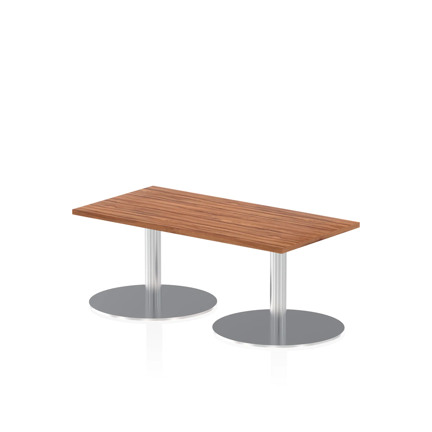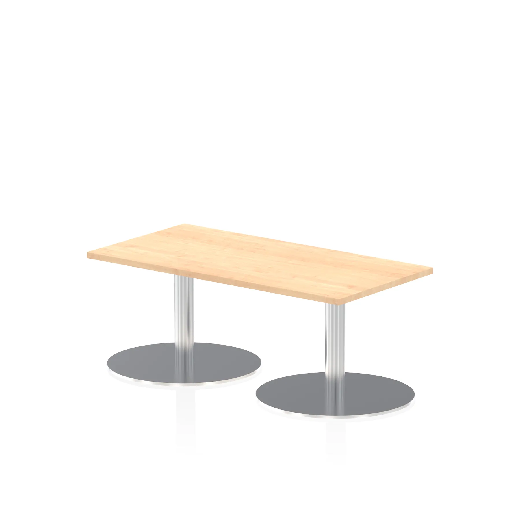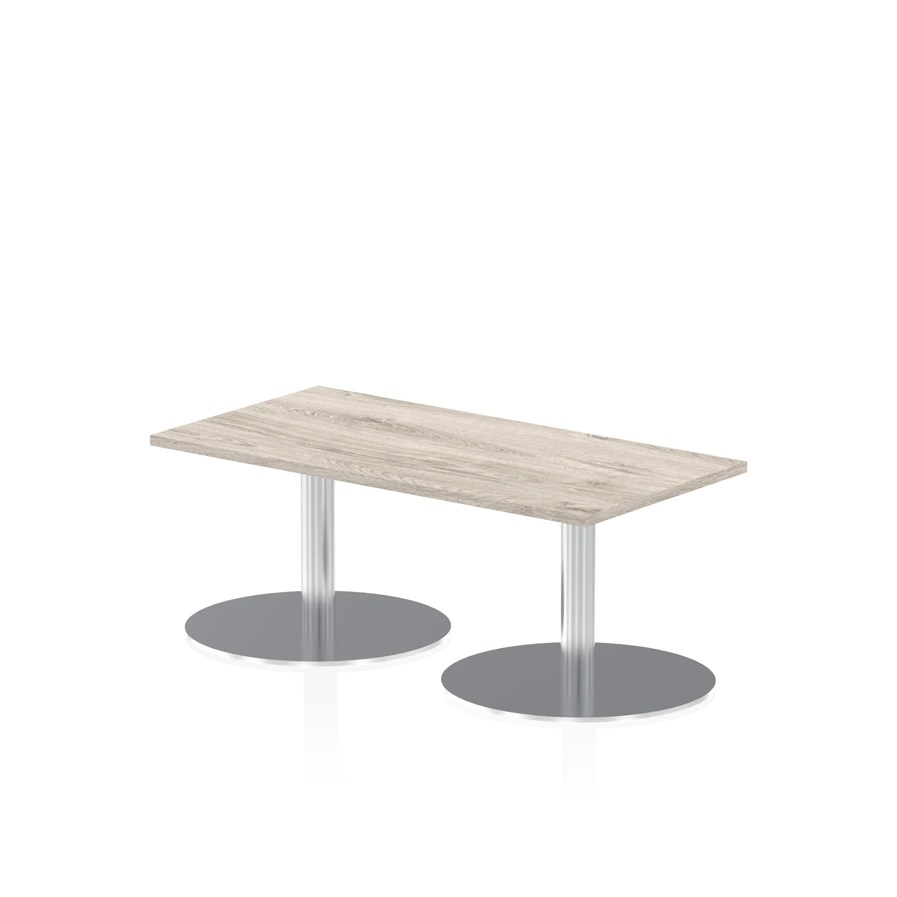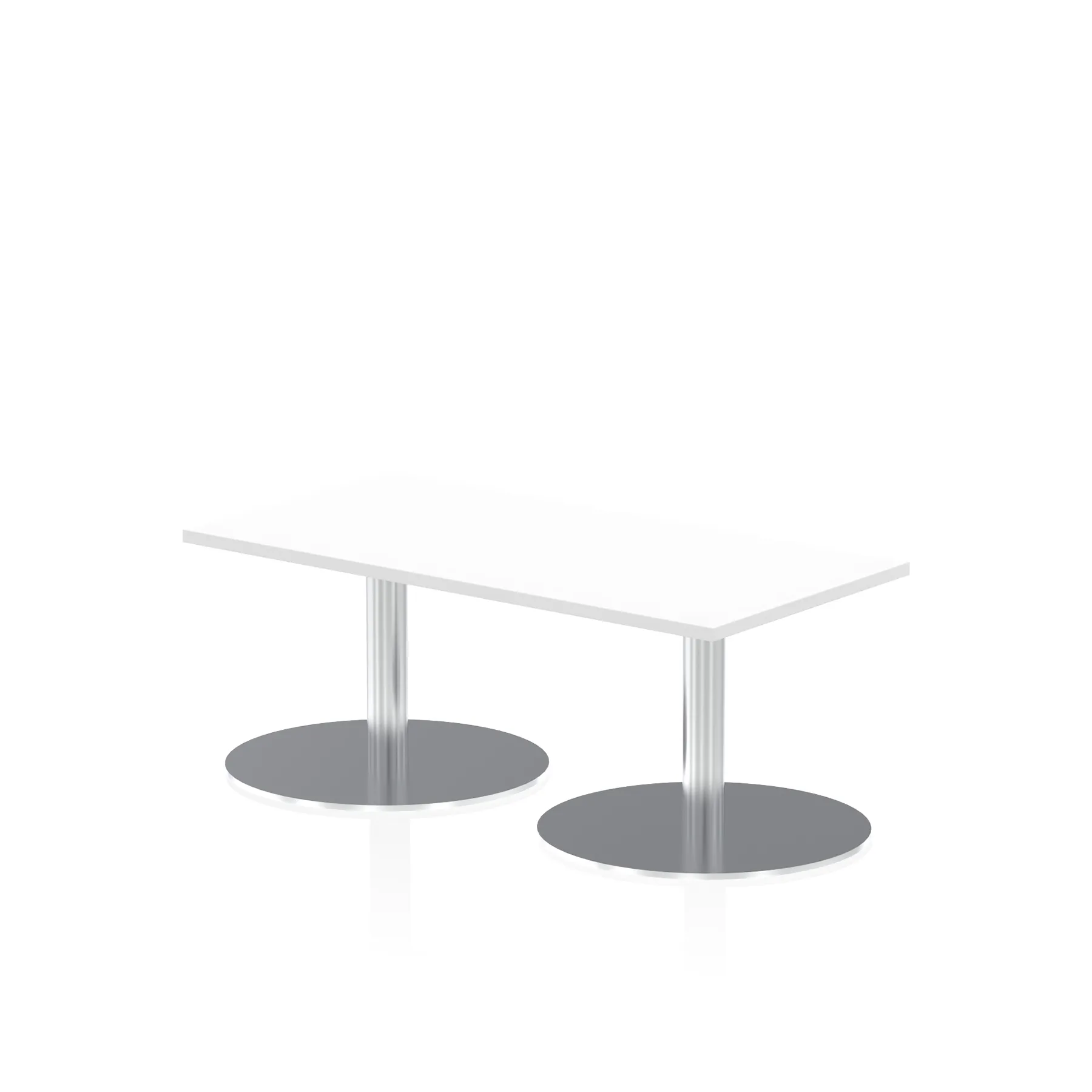 25mm thick desk top profile | Dual, brushed stainless steel effect circular base (580mm diameter) | Brushed stainless steel pillars (76mm diameter) | Weighted base provides stability | Two part bolted frame system