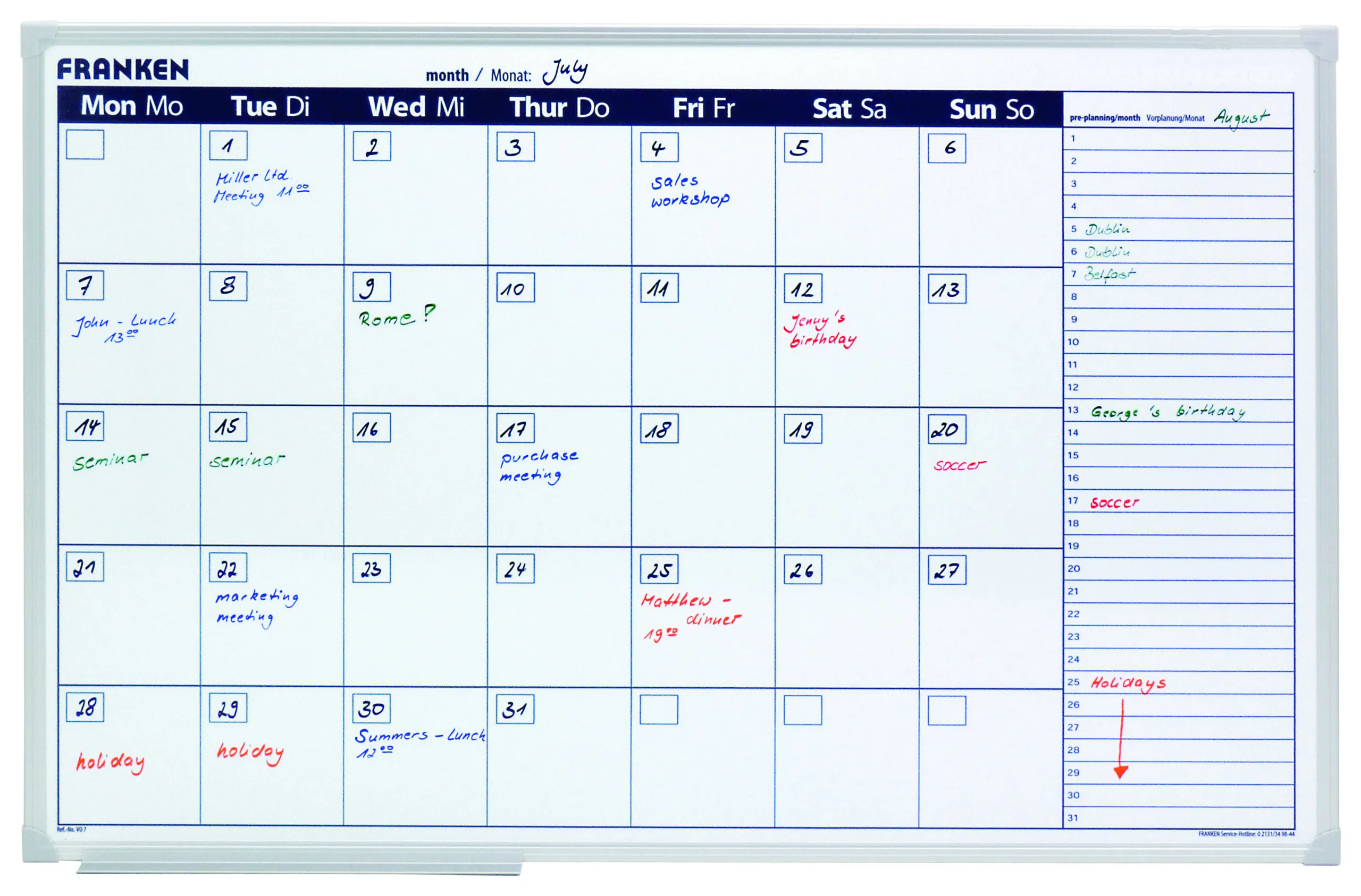 • Monthly Planner • Monthly planner displays a whole month’s planning • Project planning for a full month on show and overview column for the next month • Magnetic board surface with silver anodised aluminium frame • Includes marker tray and mounting kit • Board size: 900x600mm (WxH) • Grid Size: 96 x 98mm