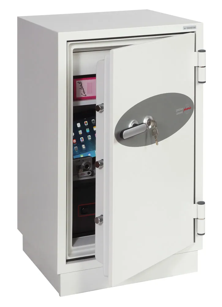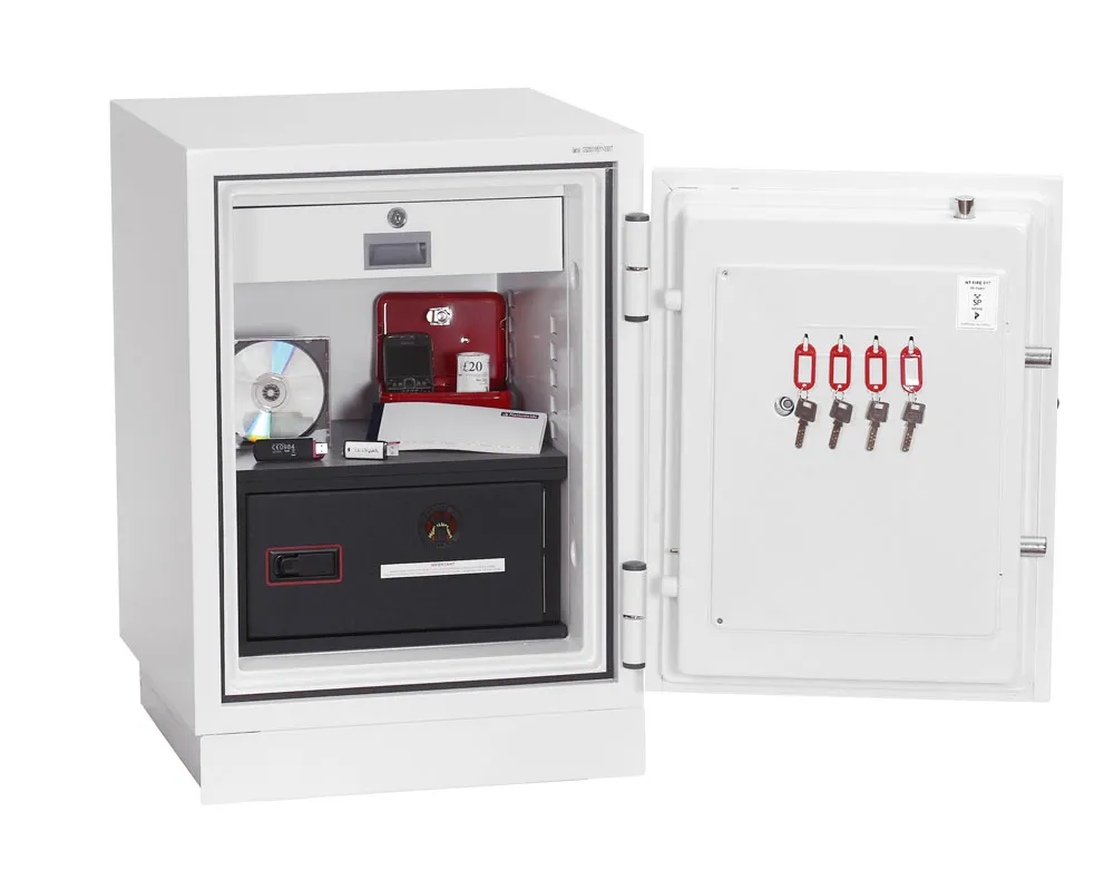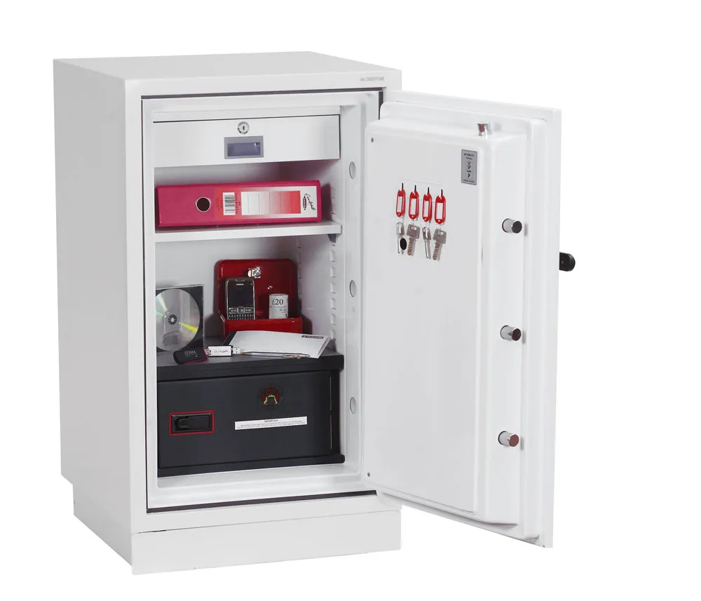 FIRE PROTECTION (PAPER) – Tested to Swedish NT Fire 017 – 90 Paper (Size 1 or 2) or 120 Paper (Size 3), providing 90 or 120 minutes fire protection respectively for paper documents | FIRE PROTECTION (DATA) – Tested to Swedish NT Fire 017 – 90dis (Size 1 or 2) or 120dis (Size 3), providing 90 or 120 minutes fire protection respectively for computer diskettes, tapes and all forms of data storage | FIRE PROTECTION (DIGITAL MEDIA) – Tested to MTC – DIP120 – 60DM fire test standard, providing 60 minutes fire protection for digital media, DVD’s, USB memory sticks and hard drives | SECURITY PROTECTION – Recommended for an overnight cash risk of £2,500.00 or £25,000.00 valuables | DROP TEST – Fire and impact tested from 9.1 metres for resistance to the impact of falling through the burning floors of a building | FITTINGS – Each safe comes complete with a height adjustable shelf, lockable drawer and internal key hooks | FIXING – Ready prepared for floor fixing with fixing bolts for concrete supplied | SPECIAL FEATURES – Fitted with automatic slam shut door locking | COLOUR – Finished in a high quality scratch resistant paint RAL9003 White