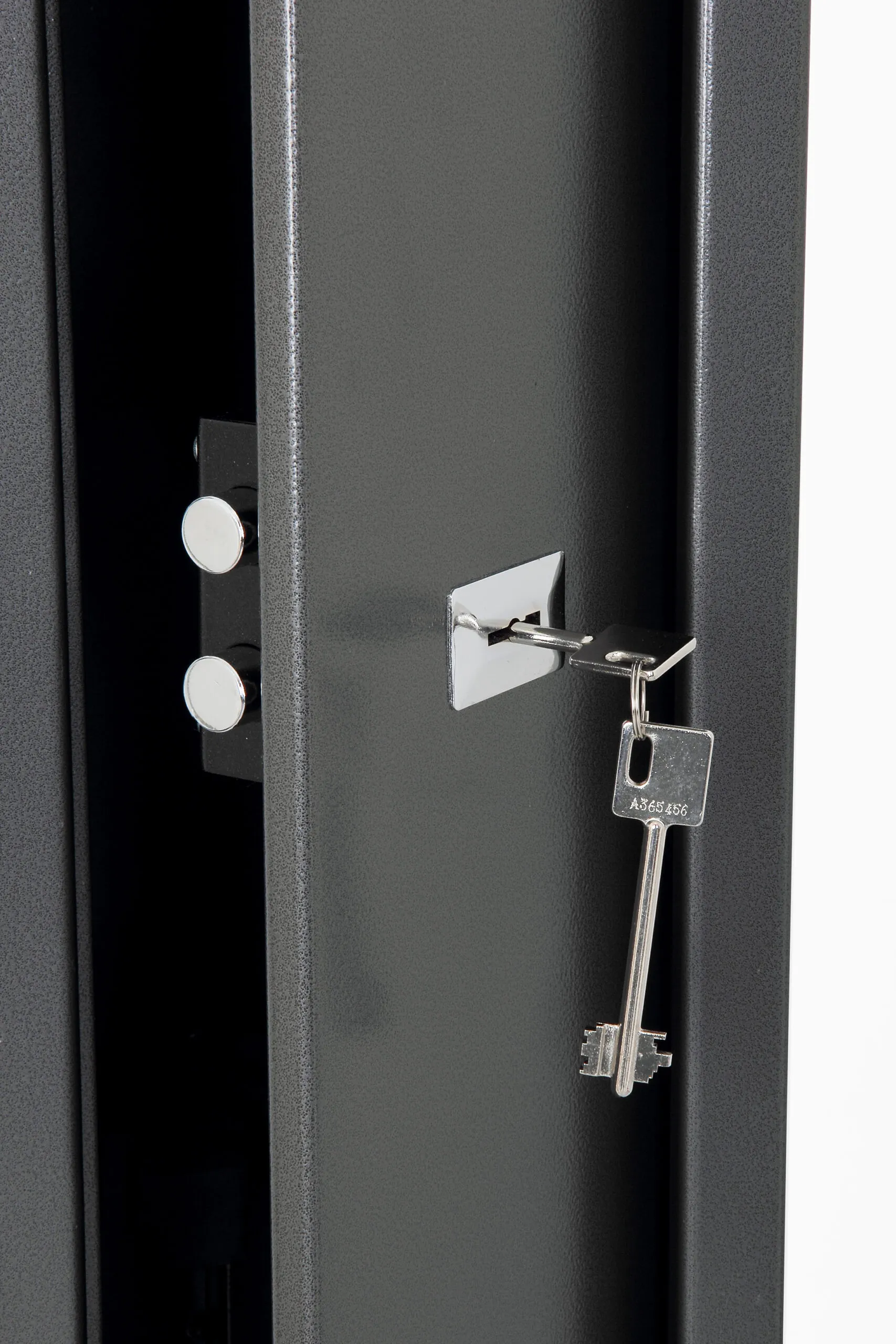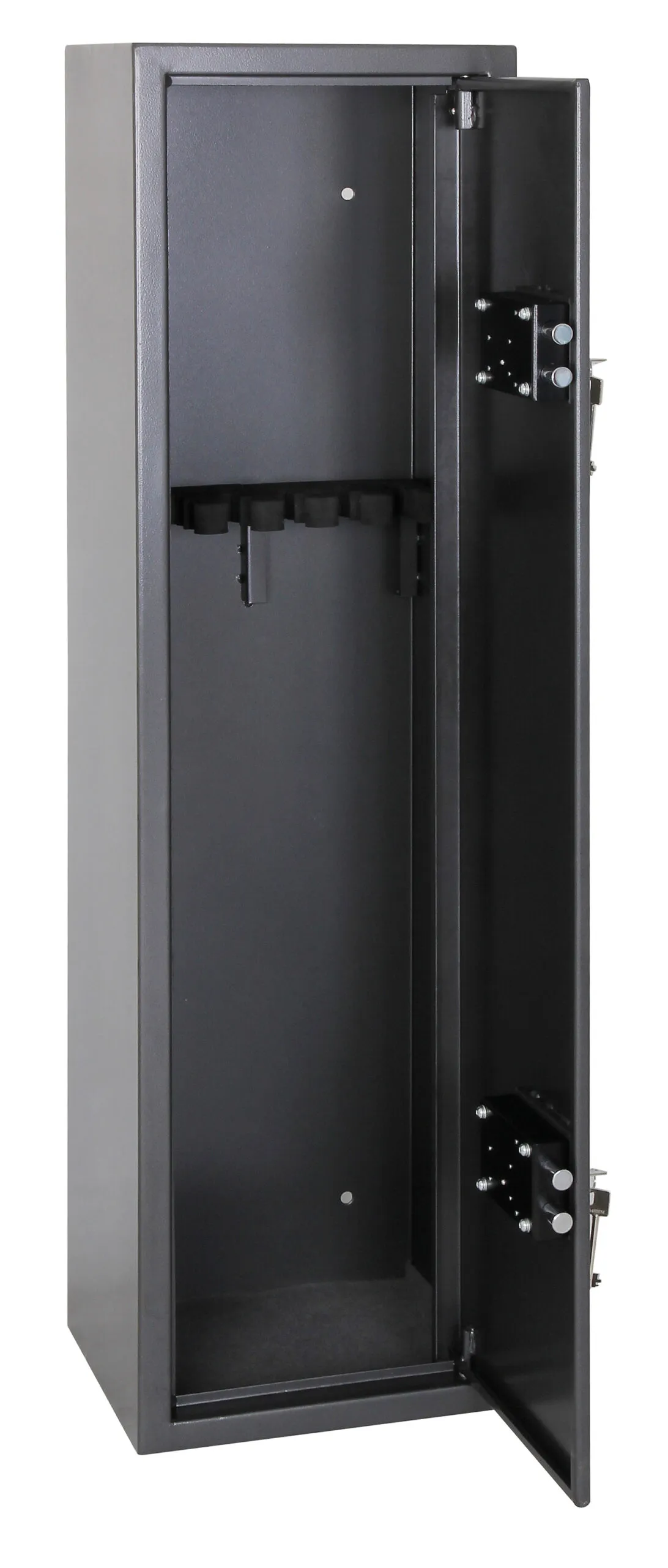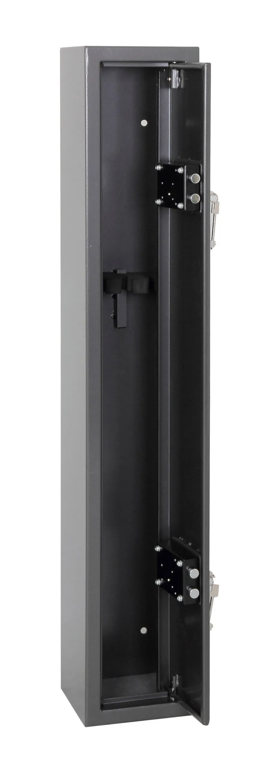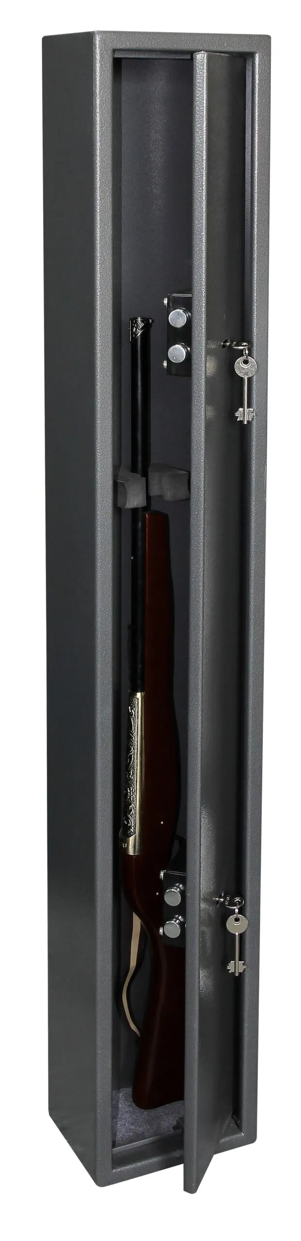 SECURITY PROTECTION – Tested to British Standard BS7558/92. 100% Police Approved | NO. OF GUNS – 1, 2 or 6 | LOCKING – Two high security 7 lever locks supplied with two double bitted keys | CONSTRUCTION – Galvanised steel body and door. High density foam divider and floor mat | FIXING – Ready prepared for fixing to the floor or wall, with fixing bolts supplied | COLOUR – Finished in a high quality durable Metallic Graphite paint.