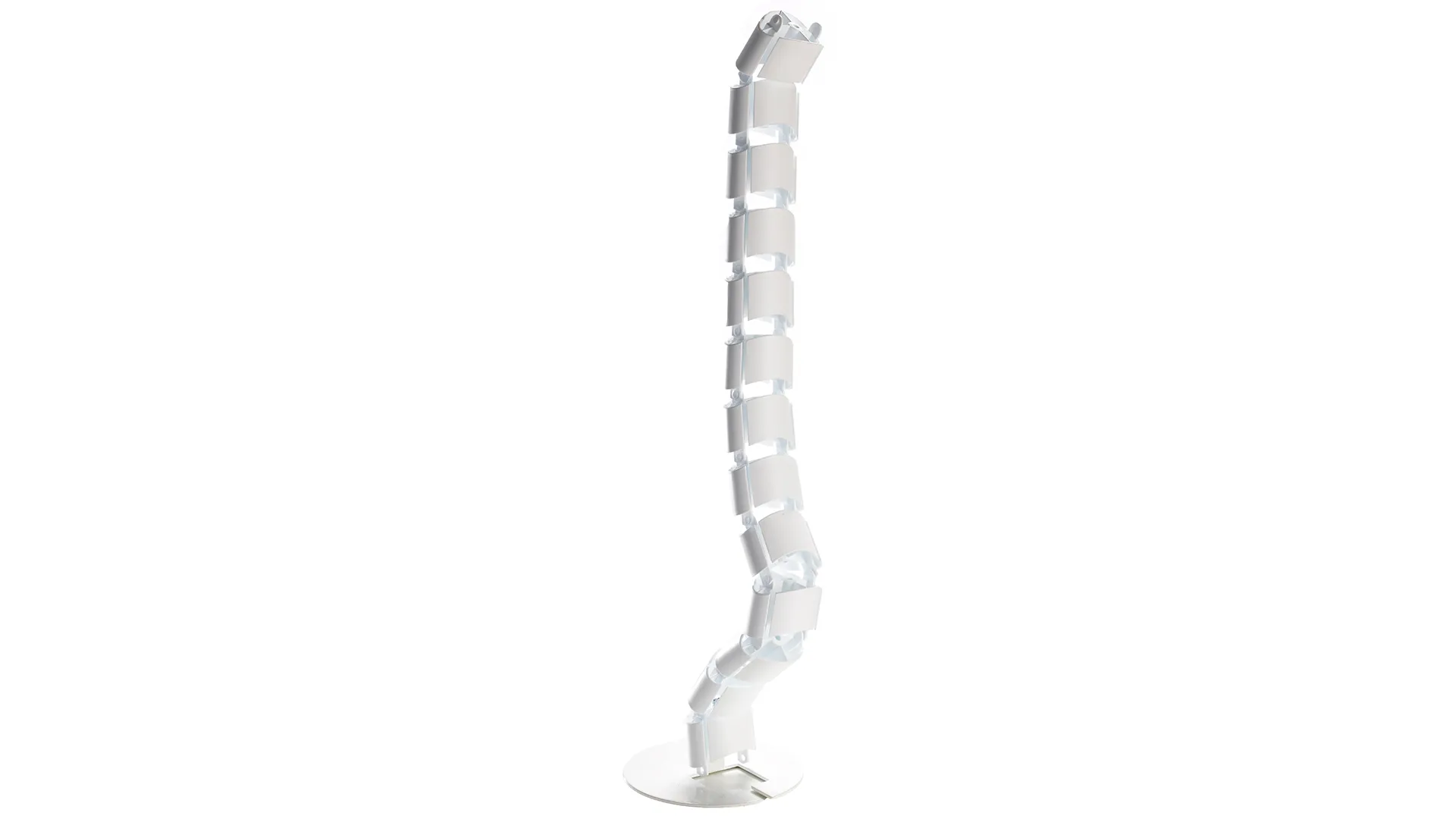 Plastic umbilical style cable management spine | Accomodates multiples cables | Easy fixes to underside of desk | Weighted shoe anchors to the floor | Cables will easily fold in and out.